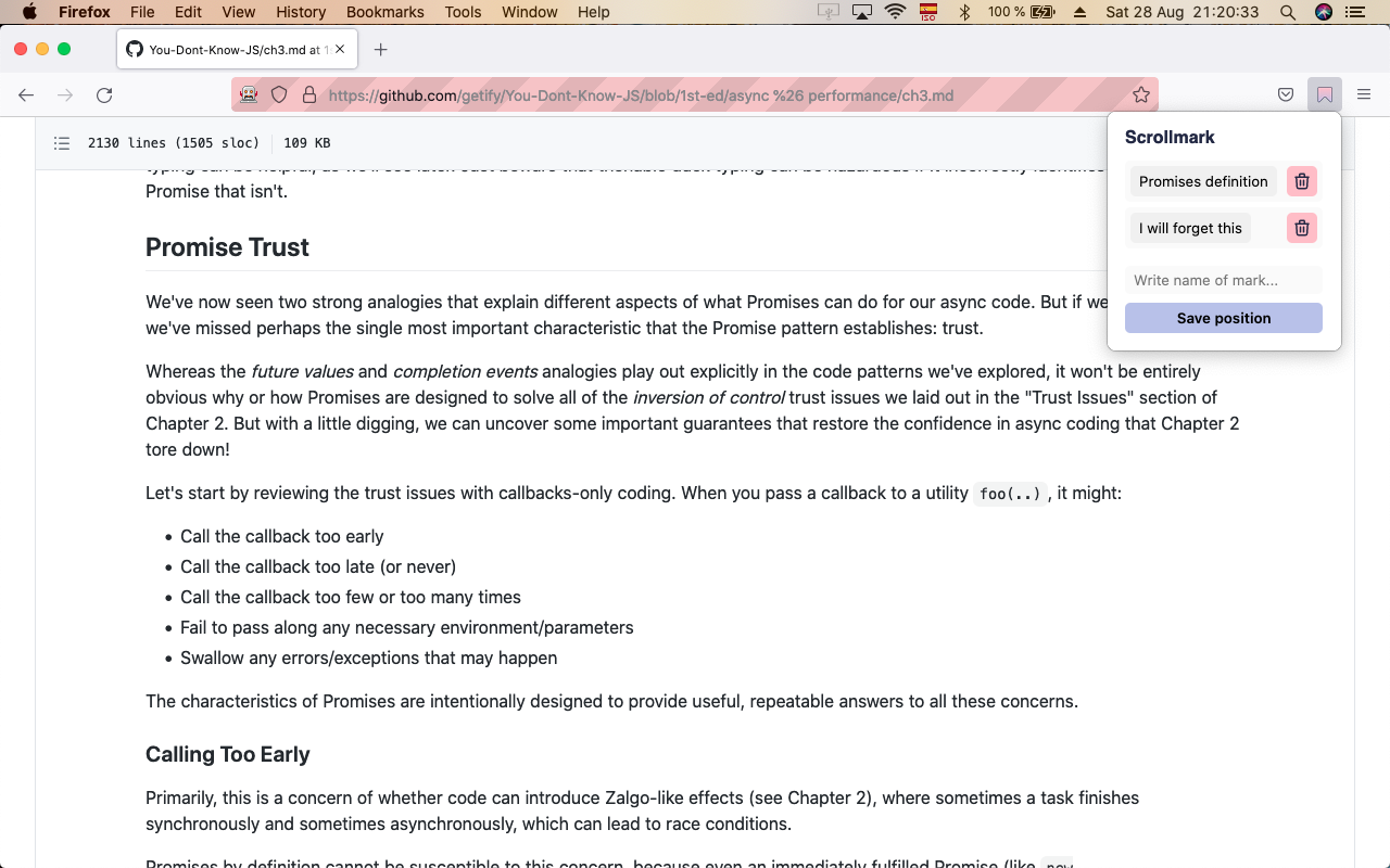 Firefox extension to save scroll position in a website. It makes easier to remember where you left your reading, mark important information, etc.