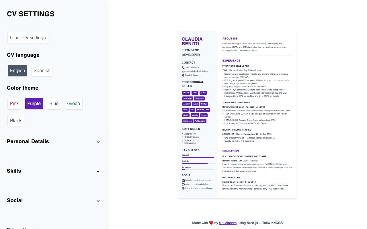 Create your CVs quickly in both English and Spanish with this PWA that is built with Nuxt.js and TailwindCSS. Deployed on Netlify.