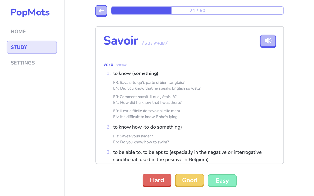 Learn the 10000 most common words in French with flashcards using spaced repetition technique, for free and no signups! Build with Vue 3 and hosted in Cloudflare.